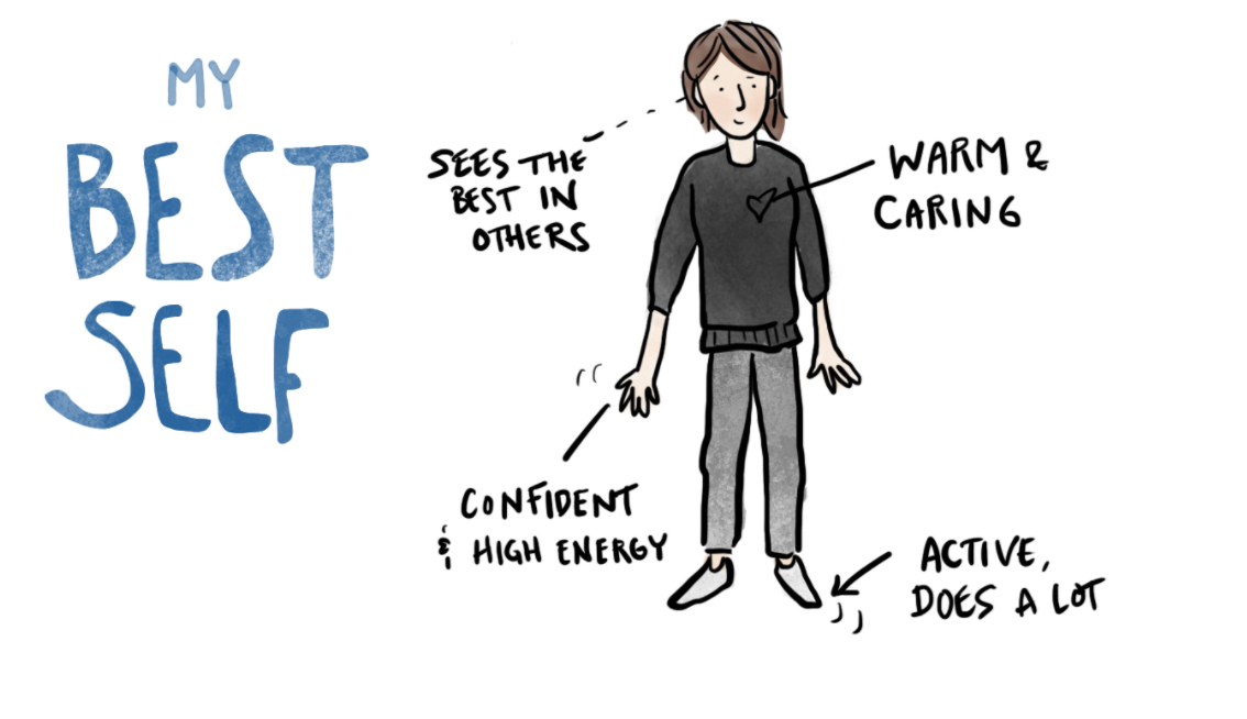 This full version of my best self isn’t always going to be happy or helpful. She can also experience difficult emotions with self-compassion, and weaves between caring for me and everyone else. She’s able to be vulnerable and show sadness, anger, frustration in front of friends and family in a skillful way. She doesn’t always have to hold it together.